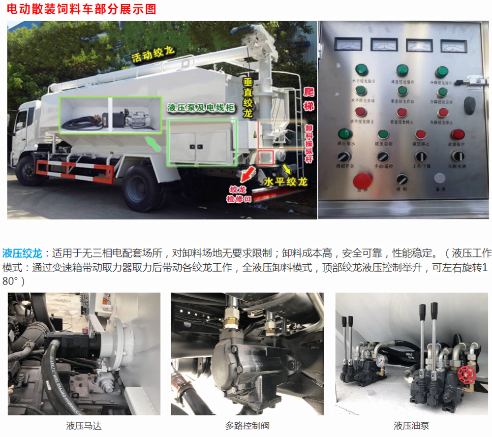 轉(zhuǎn),聯(lián)鎖保護(hù)等功能。無三相電場(chǎng)所可加裝車載發(fā)電機(jī)供電。卸料可選裝無線遙控操作。】第二種:液壓馬達(dá)卸