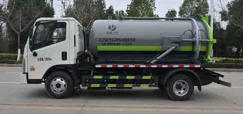 該車主要用于下水道排污及疏通,主要裝置為罐體和吸污裝置;罐體有效容積:4.1立方米;罐體外形尺寸(總長×直徑)(mm):3800×1300;隨底盤選裝駕駛室;側、后防護材料均為:Q235碳鋼,連接方式均為:螺栓連接,后部防護截面尺寸(mm):120×50,后部防護離地高度(mm):370;ABS系統控制器型號為CM4XL-4S/4M,ABS系統控制器生產企業為廣州瑞立科密汽車電子股份有限公司.卸料方式:舉升后卸式。選裝附件位置。