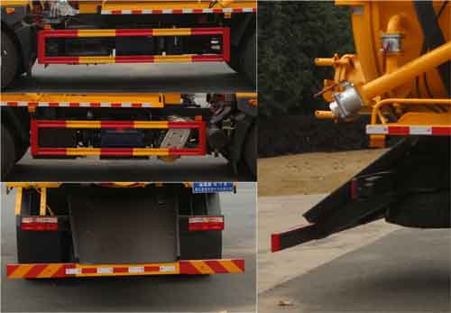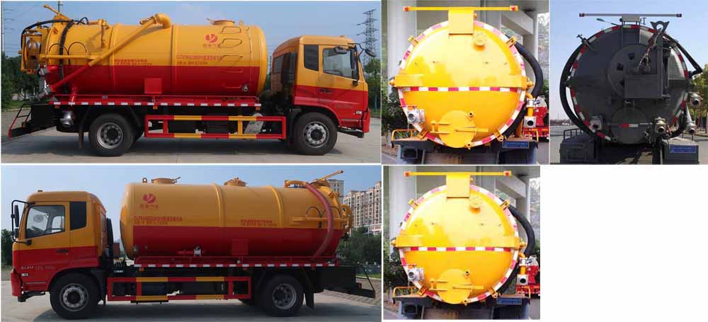 ABS型號/生產廠家:3631010-C2000/東科克諾爾商用車制動系統(十堰)有限公司,ABS 8/東科克諾爾商用車制動系統(十堰)有限公司, 4460046450/威伯科汽車控制系統(中國)有限公司,J ABS/焦作博瑞克控制技術有限公司;隨底盤選裝駕駛室,選裝后部樣式,選裝罐體左右樣式;側、后防護材料均為:Q235碳鋼,連接方式均為:螺栓連接,后部防護截面尺寸(mm):200×50,后部防護離地高度(mm):450;罐體尺寸為(直段長×直徑)(mm):5000×1950(前部1800mm為清水罐,后部3200mm為污水罐);污水罐總容量:8.14立方米,污水罐有效容積:7.75立方米,介質:液態污物,清水罐總容量:5.36立方米,清水罐有效容積:5.3立方米,介質:;專用功能及裝置:該車主要用于下水道系統的清理和疏通工作;主要裝置為貯污罐及清洗吸污裝置;其他說明:兩罐獨立,且不能同時滿載,清洗功能時用清水罐,吸污功能時用污水罐;選裝限速裝置,限速89.選裝油箱,電瓶安裝位置。