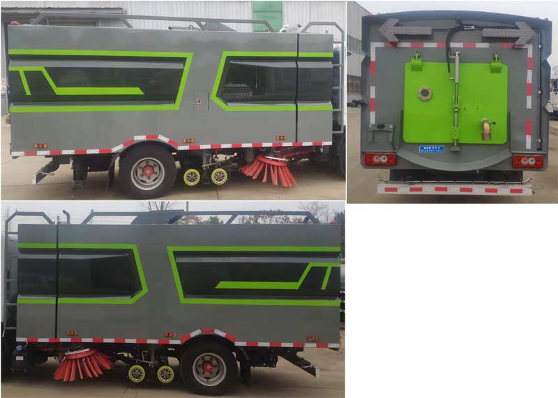 該車主要作用于路面的清掃作業(yè);專用裝置為洗掃裝置、垃圾箱。隨底盤選裝駕駛室;側(cè)防護(hù)為專用裝置代替,后防護(hù)材料為:Q235碳鋼,連接方式為:螺栓連接,后部防護(hù)截面尺寸(mm):120×50,后部防護(hù)離地高度(mm):350;ABS系統(tǒng)控制器型號為CM4XL-4S/4M,ABS系統(tǒng)控制器生產(chǎn)企業(yè)為廣州瑞立科密汽車電子股份有限公司.選裝左右及后部樣式。