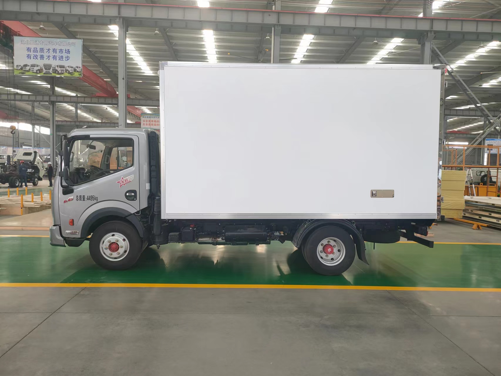 東風凱普特星云4.2米冷藏車采用東風輕型發動機或玉柴發動機,采埃付5變速箱,NPR沖壓后橋(帶制動襯片磨損報警),7.00R16輪胎,斷氣剎、單排翻轉、車載無線服務控制器(T-BOX)、ABS、離合助力、動轉,
