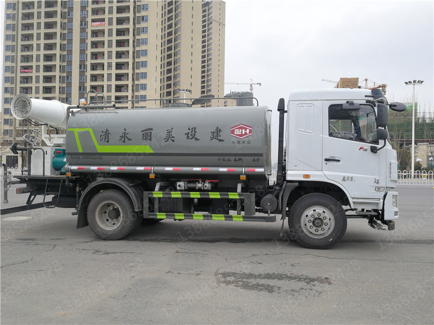 東風華神F5霧炮車_華神玉柴165抑塵車_華神12方抑塵車,國六華神霧炮車,12方霧炮車價格該車用途為抑塵降霾.主要裝置為罐體及噴霧裝置;隨底盤選裝駕駛室,選裝噴霧裝置樣式;罐體總容量:11.5立方米;罐體有效容積:10.9立方米;罐體外形尺寸(×長軸×短軸)(mm):4000×2300×1540;側、后防護材料均為:Q235碳鋼,連接方式均為:螺栓連接,后部防護截面尺寸(mm):120×50,后部防護離地高度(mm):450;ABS型號及生產廠家為:3631010-C2000/東科克諾爾商用車制動系統(十堰)有限公司,J ABS/焦作博瑞克控制技術有限公司。采用3950mm軸距。選裝水泡支架位置,選裝自動球閥安裝位置,選裝自動炮樣式,前伸500mm,整車長度為8260,8400(mm)