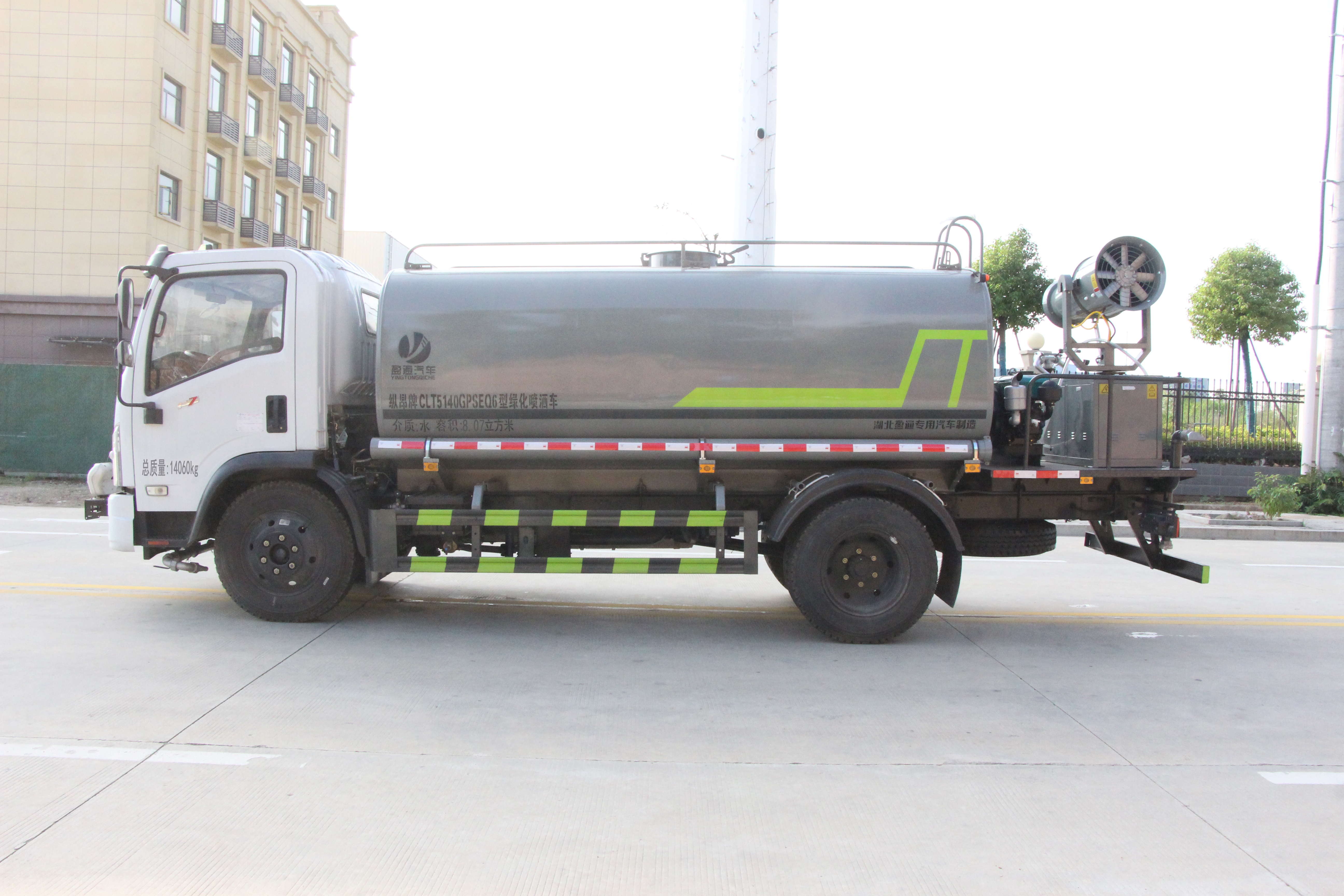 選裝噴霧裝置樣式;ABS型號:ABS/ASR-24V-4S/4M;ABS生產企業:襄陽東風隆誠機械有限責任公司;隨底盤選裝駕駛室;側、后防護材料均為:Q235碳鋼,連接方式均為:螺栓連接,后部防護截面尺寸(mm):120×50,后部防護離地高度(mm):440;罐體總容量:8.47立方米;罐體有效容積:8.07立方米;罐體外形尺寸(×長軸×短軸)(mm):4000×2050×1450;該車主要用于城鄉園林綠化噴灑,噴藥;主要裝置為水罐及噴灑裝置;隨底盤選裝油箱左右位置.選裝自動球閥安裝位置,選裝后部噴灑裝置樣式.選裝前部電子炮樣式,前伸500mm,整車長度為7750mm,7950mm.選裝罐體頂部方形罐口樣式及罐口位置,選裝工具箱,選裝箭頭燈裝置,選裝高位花灑裝置,選裝車輛前部鴨嘴裝置.后部作業燈僅在作業時開啟,車輛行駛過程中不可開啟.