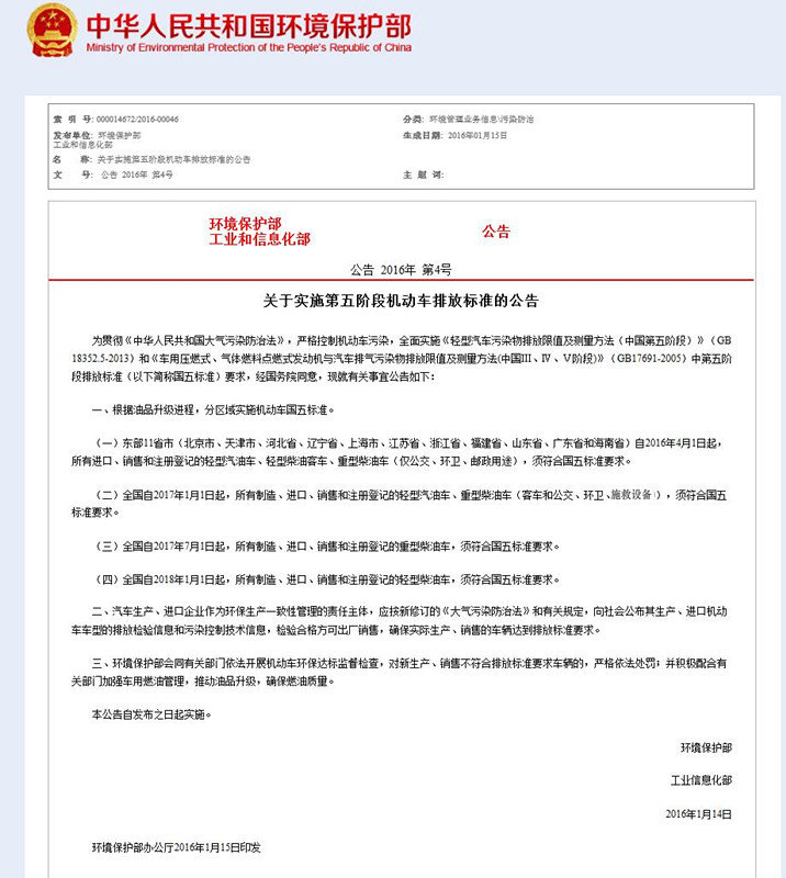 。ㄒ唬〇|部11省市(北京市、天津市、河北省、遼寧省、上海市、江蘇省、浙江省、福建省、山東省、廣東省和海南。┳2016年4月1日起,所有進口、銷售和注冊登記的輕型汽油車、輕型柴油客車、重型柴油車(僅公交、環衛、郵政用途),須符合國五標準要求。