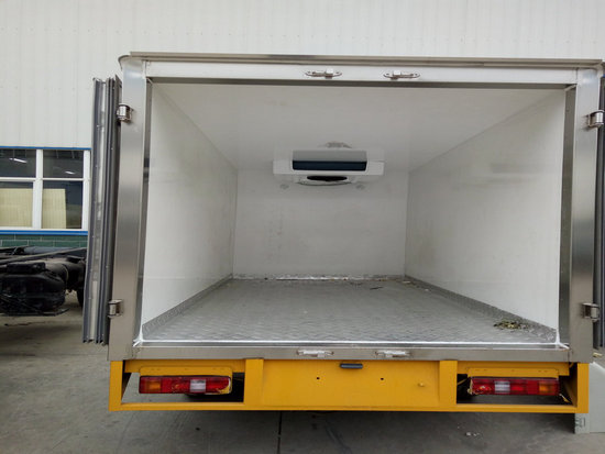 冷藏車廂體:采用國標A級聚氨酯保溫材料,厚度為8厘米,廂體內外采用玻璃鋼材質全包裹。不銹鋼鎖件。包角、包邊鋁合金型材。底盤采用高強度花紋鋁板定制。可選裝肉鉤導軌,和底部通風槽。廂體材質為內外玻璃鋼,中間夾層采用5個厚聚氨酯發(fā)泡隔熱材料,廂體一次成型,底板為花紋鋁板,門框邊飾全不銹鋼件,后門雙開。