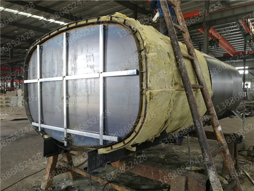 另一種則是聚氨脂材料發泡保溫。聚氨脂泡沫材料的填充是利用專門的發泡機械將化學生成的發泡體噴吐至罐體與骨架之間。噴吐時慢慢的堆積成型,這樣使泡沫材料更加嚴實。對于多余的或高于骨架外型表面的發泡體,利用鏟刀將其打磨。外表蒙上一層0.8mm厚的冷軋板,采用抽芯鉚釘將冷軋板固定在骨架上。