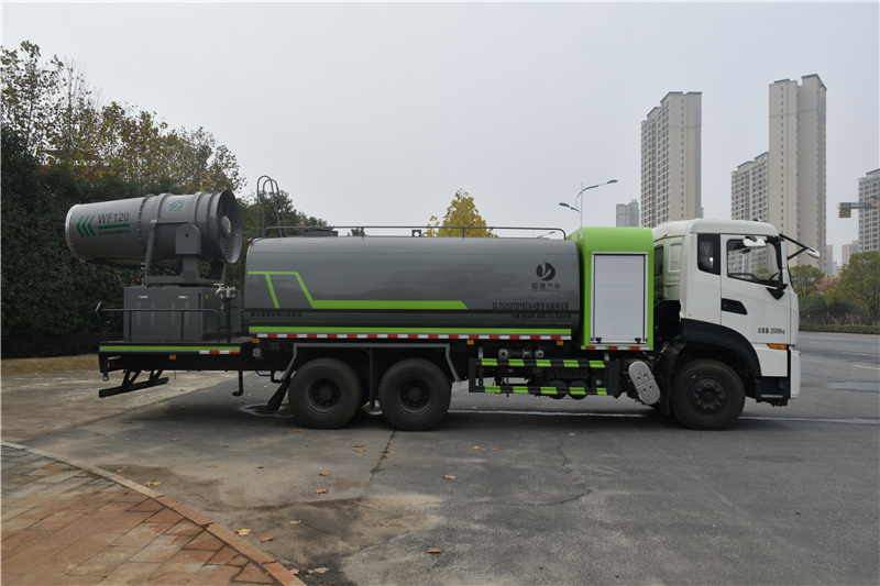 天龍18方灑水車_天龍80米抑塵車_天龍100米霧炮車_湖北盈通專用汽車有限公司,該車用途為抑塵降霾,主要裝置為罐體及噴霧裝置;隨底盤選裝駕駛室,選裝噴霧裝置樣式;罐體有效容積:14立方米,罐體外形尺寸(×長軸×短軸)(mm):5000×2400×1700;側、后防護材料均為:Q235碳鋼,連接方式均為:螺栓連接,后部防護截面尺寸(mm):120×50,后部防護離地高度(mm):480;ABS型號/生產廠家:3631010-C2000/東科克諾爾商用車制動系統(十堰)有限公司,ABS 8/東科克諾爾商用車制動系統(十堰)有限公司,4460046450/威伯科汽車控制系統(中國)有限公司.安裝120霧炮時,后伸930mm,對應整車長度為11580mm。選裝油箱蓄電池及儲氣筒側面布置.選裝限速裝置,限速89km/h