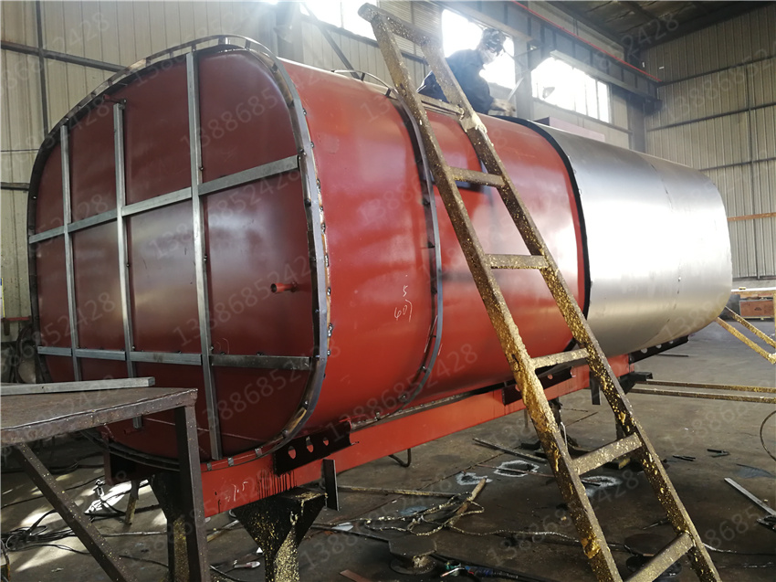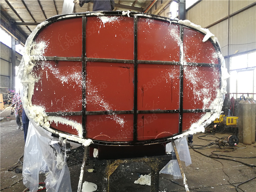 3. 保層溫的制作是在水罐外部另外焊接10mm厚的支撐骨架,然后用保溫材料將骨架內(nèi)部填充滿,**在骨架外蒙上一層外皮。 保溫層外表鐵皮采用8mm厚高強度耐磨板,可選擇使用不銹鋼分鏡面8K或磨砂板