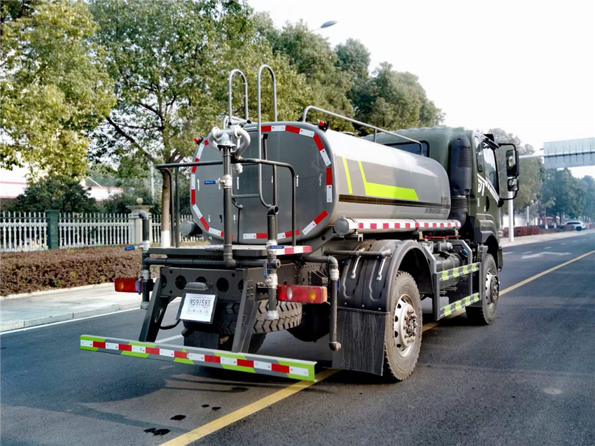 后爬梯。平臺后部帶小安全告知牌:“隨時停車,注意安全”,帶兩根水管及陰陽端。罐體兩側噴“灑水車、