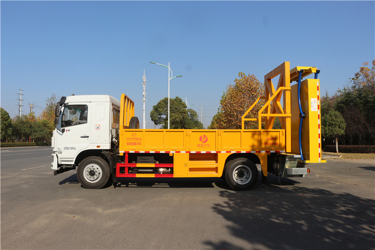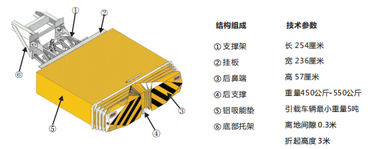 上裝配置:護箱:采用Q235國標邊3mm底板花紋板4mm厚,箱體后部防撞包采用美國進口T90型號,防撞緩沖吸能模塊主要由車載防撞緩沖墊和導(dǎo)向標志架組成,充當施工作業(yè)車輛后方的緩沖衛(wèi)士。如若發(fā)生追尾事故,能夠在肇事車輛和前方施工作業(yè)區(qū)域之間構(gòu)建一個緩沖區(qū)域,通過機具結(jié)構(gòu)變形吸收撞擊的能量,最大限度地降低被保護人員及設(shè)備遭到碰撞的幾率。高性能液壓系統(tǒng),可實現(xiàn)快速舉升和落下操作,方便設(shè)備運輸轉(zhuǎn)場,一鍵啟動功能,舉升和落下防撞裝置,當防撞裝置未完全落下到工作位置或舉升到垂直運輸位置時,會有自動警告音提示。