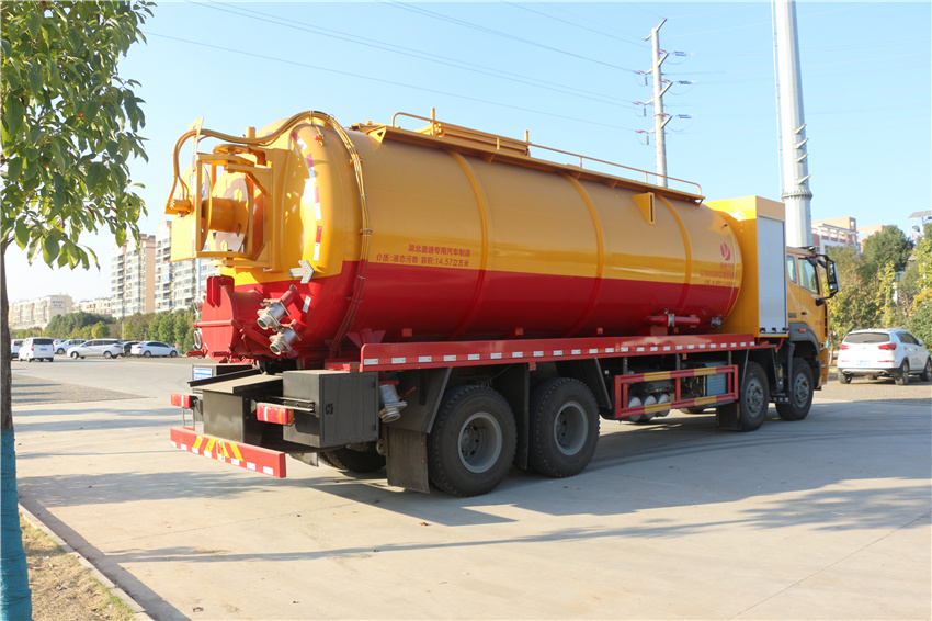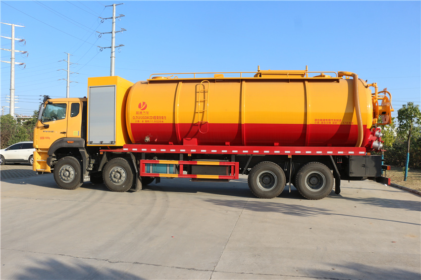 重汽35方清洗吸污車,豪沃35方疏通吸污車,管道疏通車,市政下水道清理車,高壓清洗吸污車,該車專用裝置主要為污水罐和清水罐,用于下水道吸污及疏通。隨底盤選裝駕駛室;罐體尺寸(直段長×直徑)(mm):7100×2350,其中罐體前端為清水罐(直段長3150mm);后端為污水罐(直段長3950mm)。兩罐獨立,且不能同時滿載。清洗功能時用清水罐,吸污功能時用污水罐。污水罐總容量14.57立方米,污水罐有效容積13.88立方米,介質:液態污物,密度:800千克/立方米;清水罐總容量11.66立方米,清水罐有效容積11.1立方米,介質:,密度:1000千克/立方米。采用軸距(mm):1800+4600+1350,1800+4575+1400;/后防護材料均為:Q235碳鋼,連接方式均為:螺栓連接,后部防護截面尺寸(mm):200×60,后部防護離地高度(mm):480;ABS系統型號為446 004 6300,生產企業為威伯科汽車控制系統(中國)有限公司。選裝EBS,EBS系統控制器生產企業:威伯科汽車控制系統(中國)有限公司,型號:EBS3。選裝罐體頂部護欄樣式,選裝側面清洗管,選裝后罐口液壓開啟樣式,選裝后部閥門,選裝后部清洗管卷盤樣式。選裝前部不帶卷簾門保護箱.選裝尿素箱位置,選裝油浴式空濾器,,選裝左置電瓶箱,選裝大油箱,選裝雙腔大油箱,選裝消聲器及位置,選裝踏步,選裝前拖鉤。
